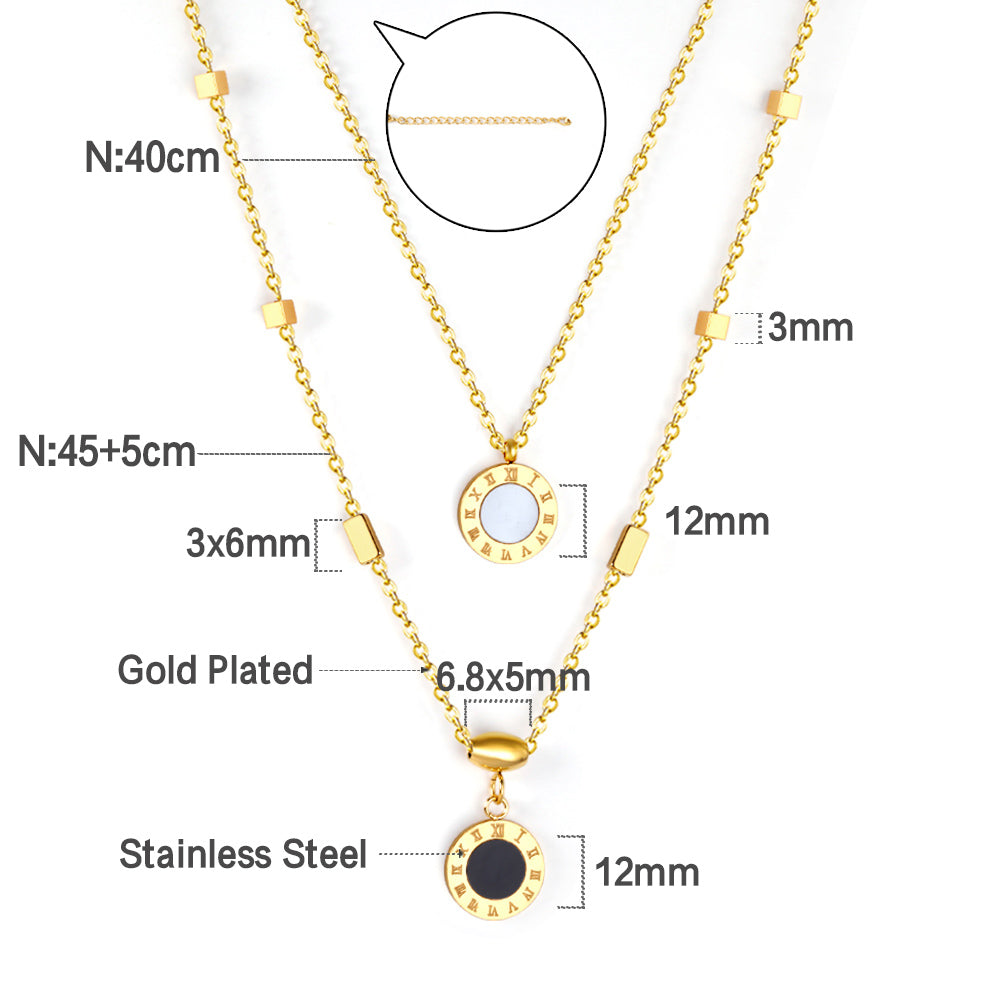 This pre-layered necklace features two distinct gold-plated chains: a shorter inner cable chain and a longer outer chain accented with polished square and rectangular stations. Both levels are anchored by reversible circular pendants featuring etched Roman numerals, with the shorter tier showcasing a white inlay and the longer tier a bold black inlay.