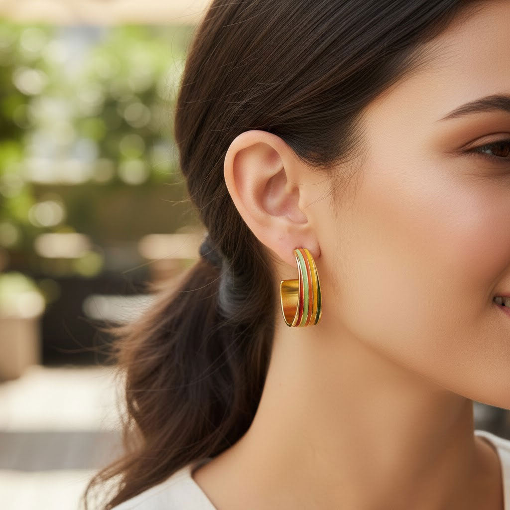 These vibrant, wide-hoop earrings feature a brilliant gold-tone finish accented with retro-inspired stripes of red, orange, yellow, and green enamel. Designed with a modern, chunky silhouette and a secure stud backing, they offer a bold pop of color to elevate any casual or chic ensemble.